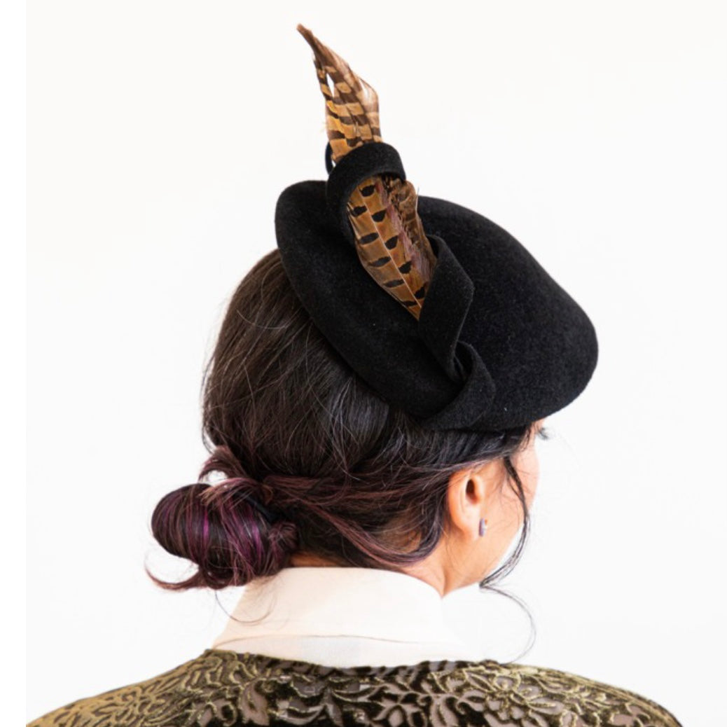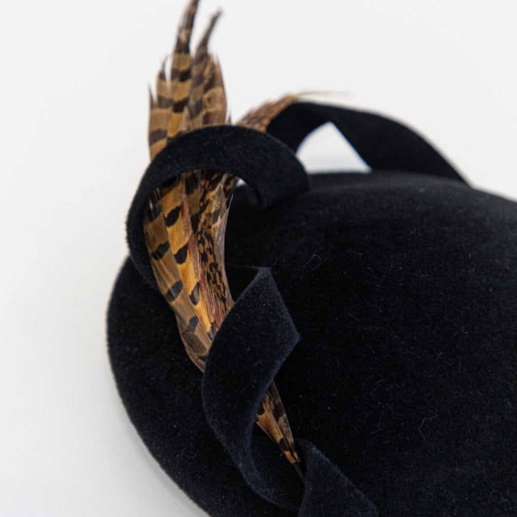 Our hand-blocked beret fascinator is beautifully made in fur felt. This beret measures approximately 8" front to back and 7" side to side. It is trimmed with a fur felt swirl and 3 pheasant feathers tucked inside. Hat is attached using hat elastic neatly tucked under the back of wearers hair.