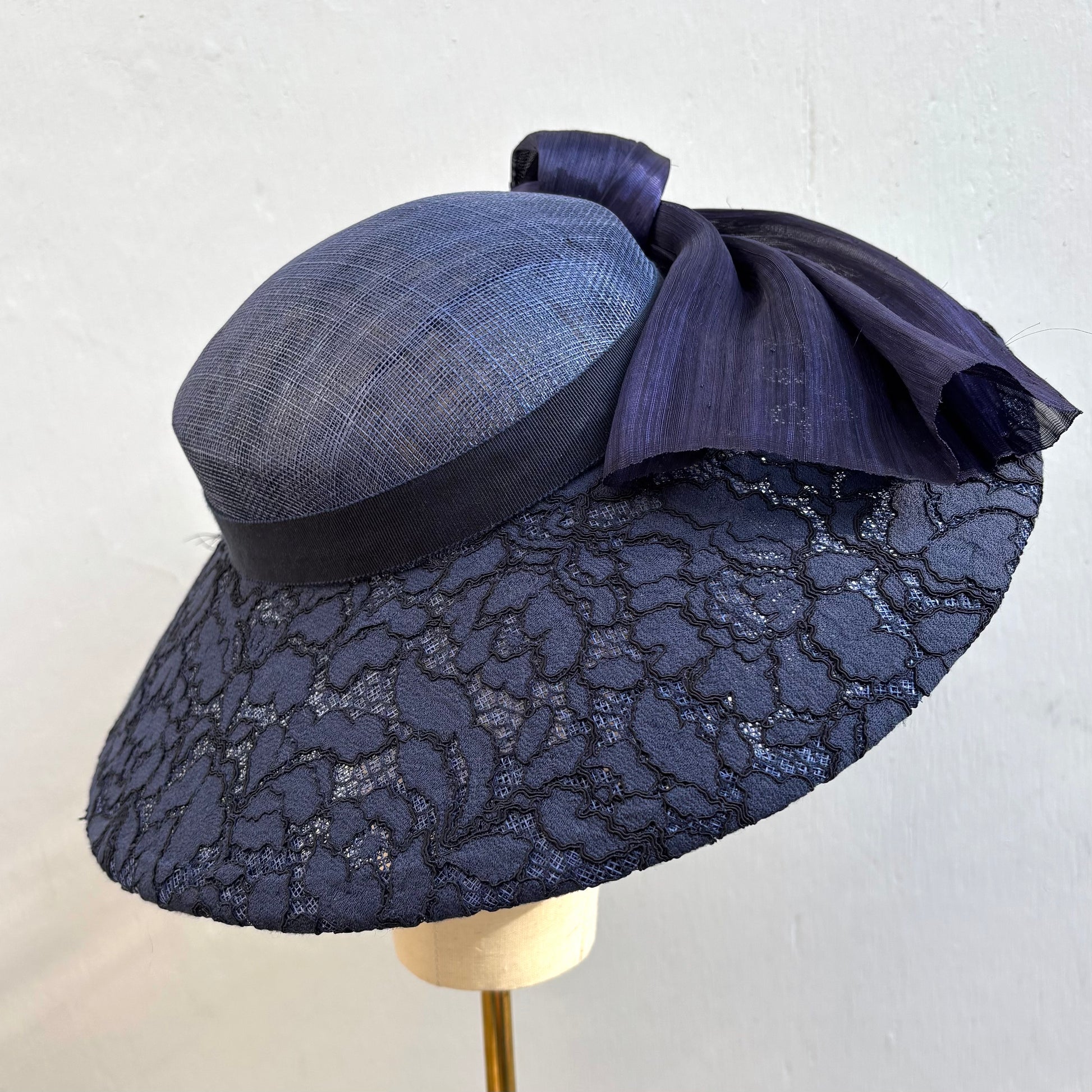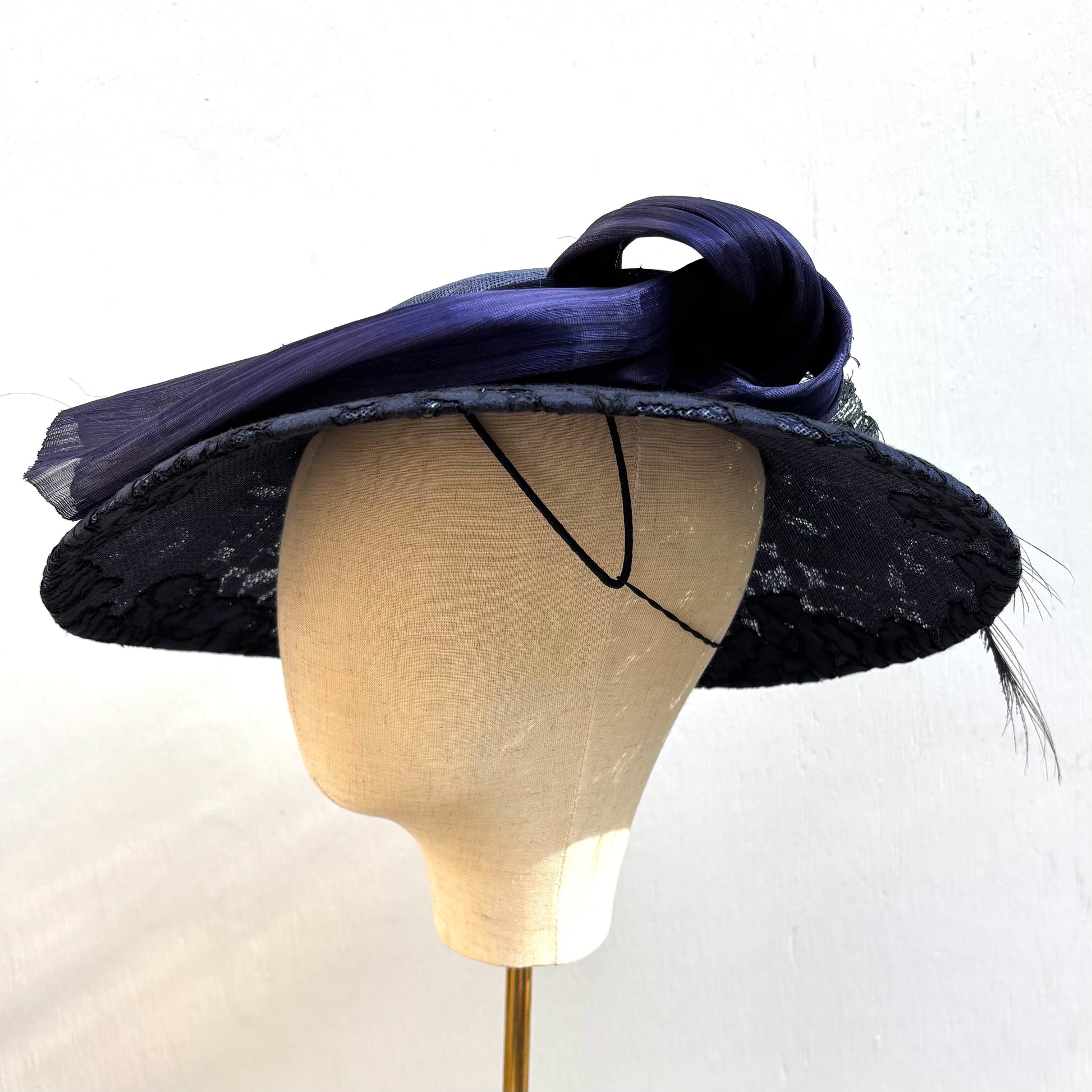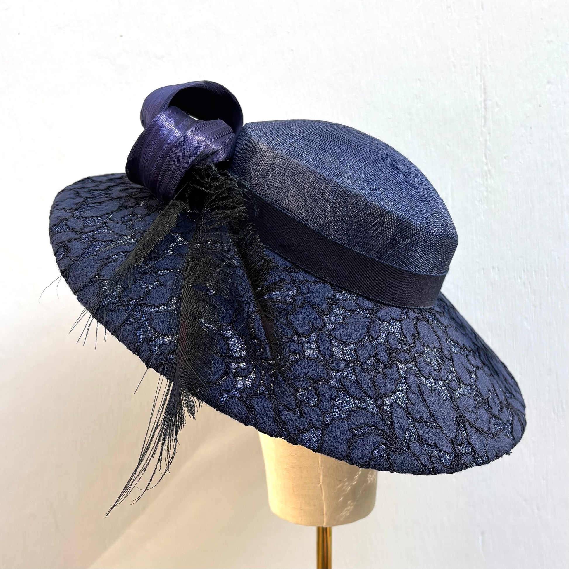 Our contemporary take on the classic boater hat features a softly angled 4" brim with a gentle downward curve and a forward-tipping crown, creating a fresh, modern silhouette. Hand-blocked in rich navy sinamay, the brim is elegantly adorned with hand-sewn guipure lace that wraps gracefully beneath the edge for an intricate, high-end finish. A sculptural swirl of silk abaca and coordinating navy peacock feathers adds dynamic movement and texture.