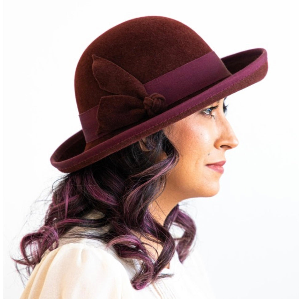Our hand-blocked Ashley hat is beautifully made in fur felt. The hat features a up-turned brim and 4” crown. Trimmed with fur felt leaves and knot.