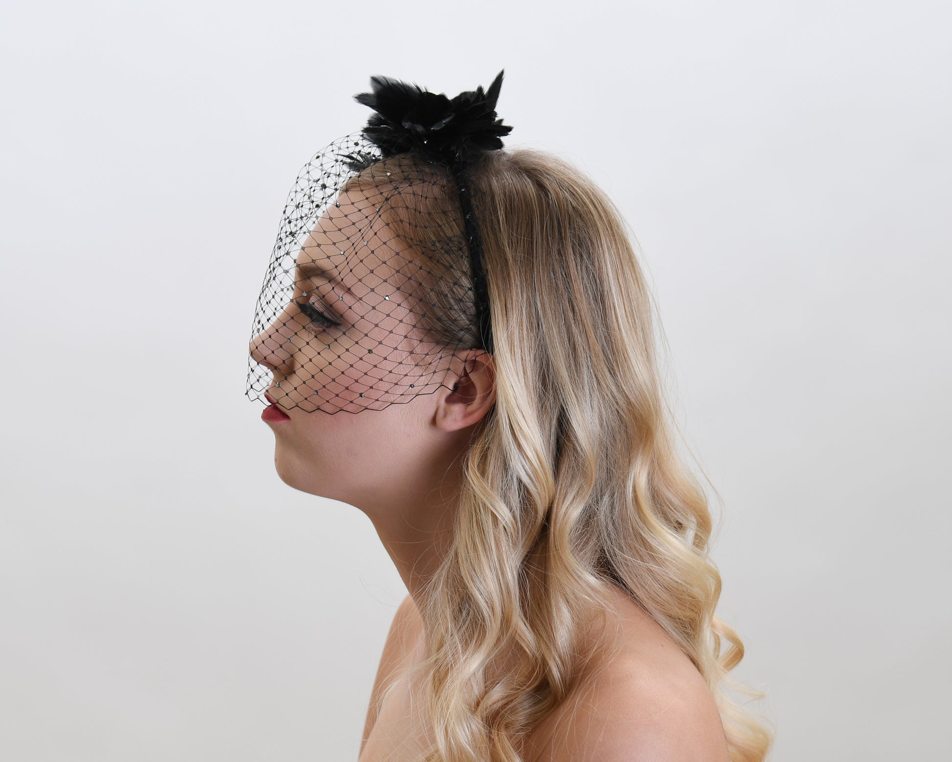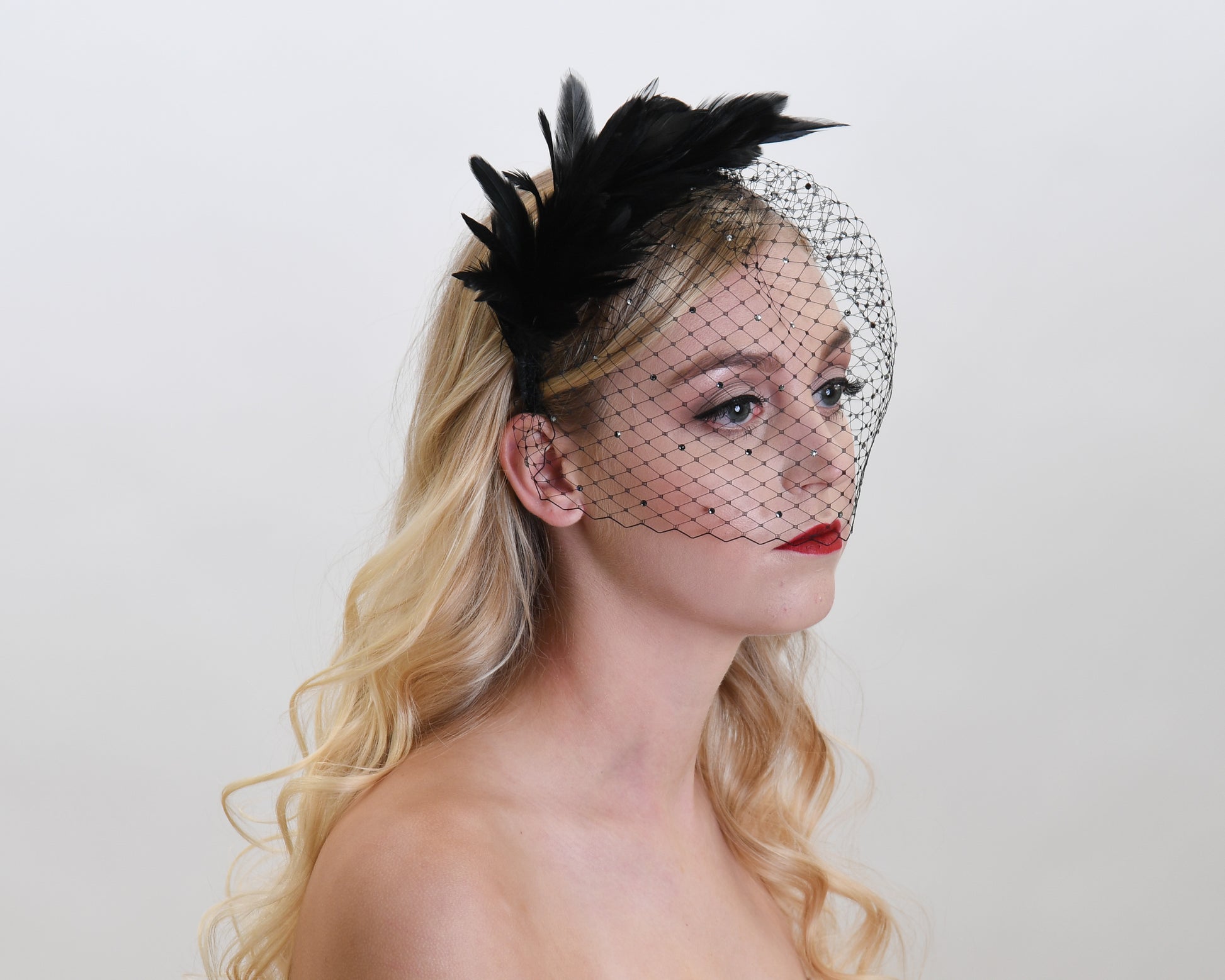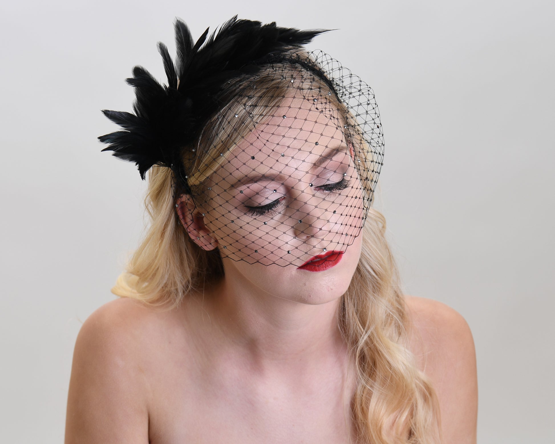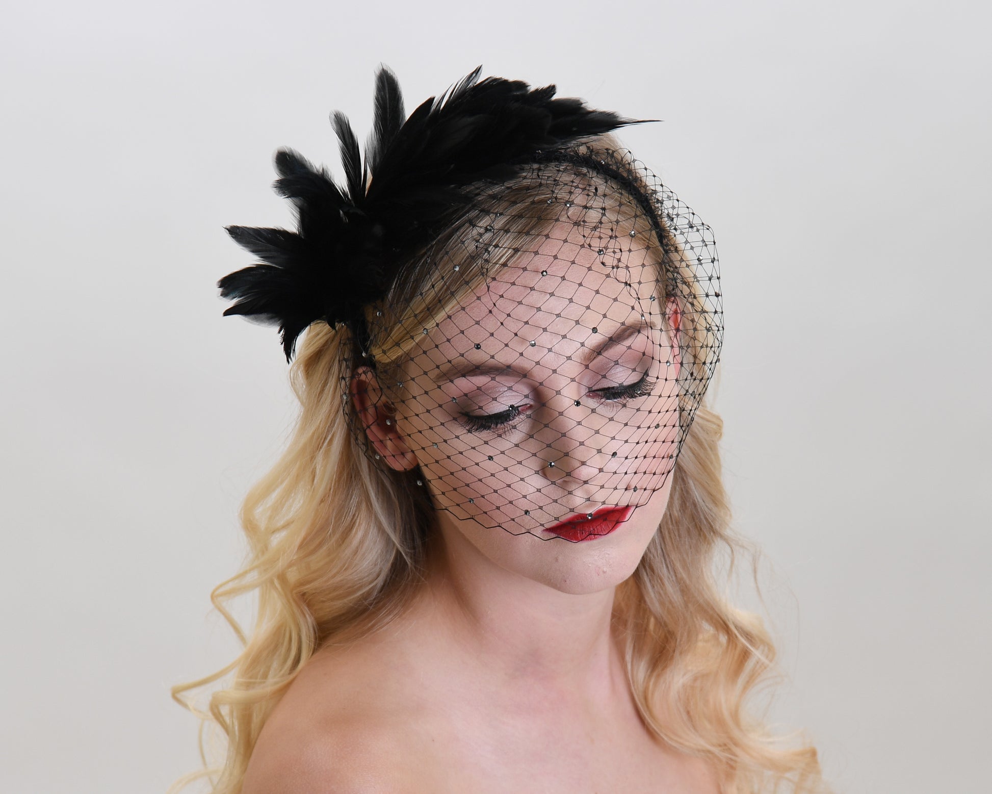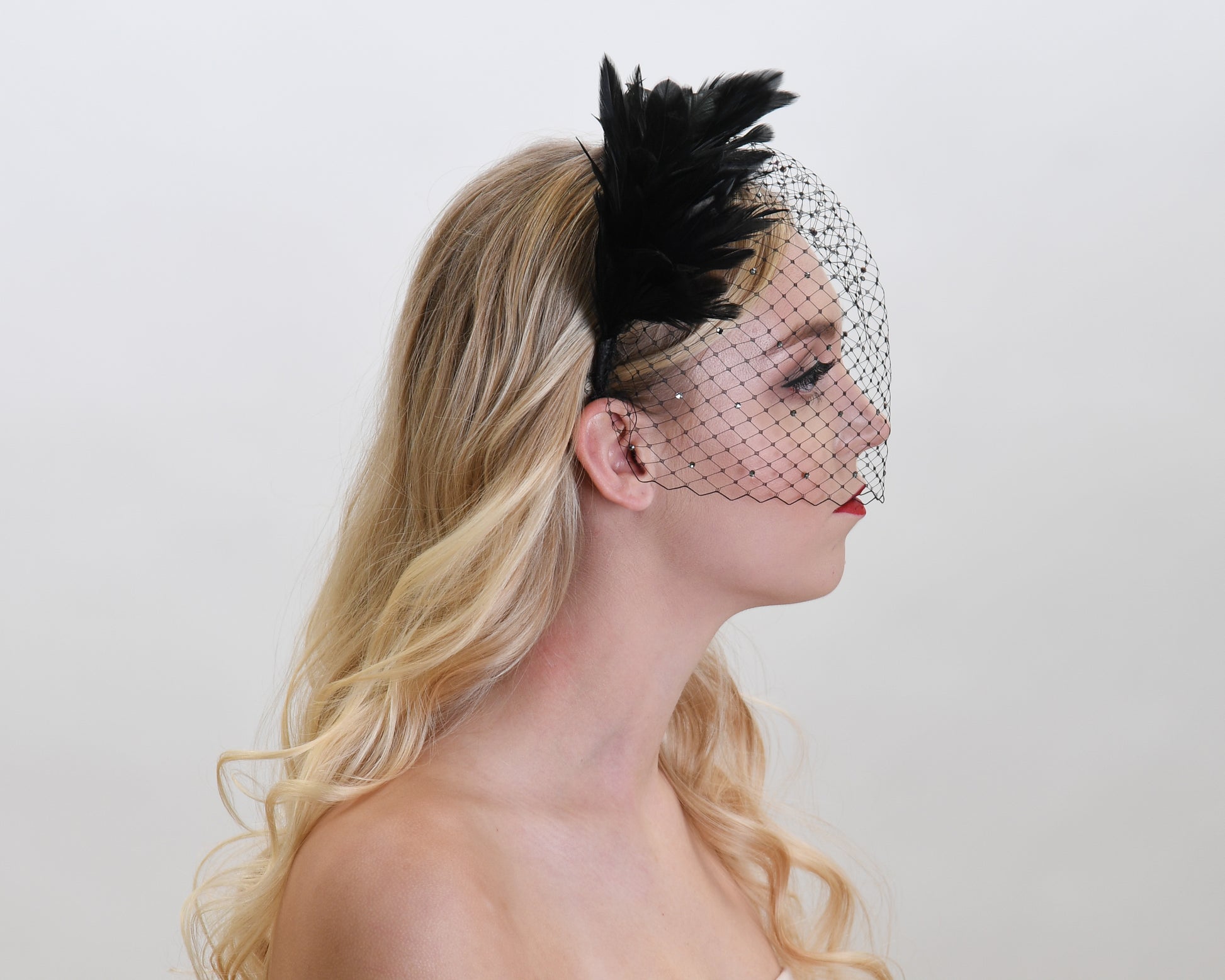 Our birdcage veil has a 1950's vintage look. The veil is hand-knotted and sewn on a metal band that is wrapped in tulle, it is accented with Swarovski crystals and black feather trim.