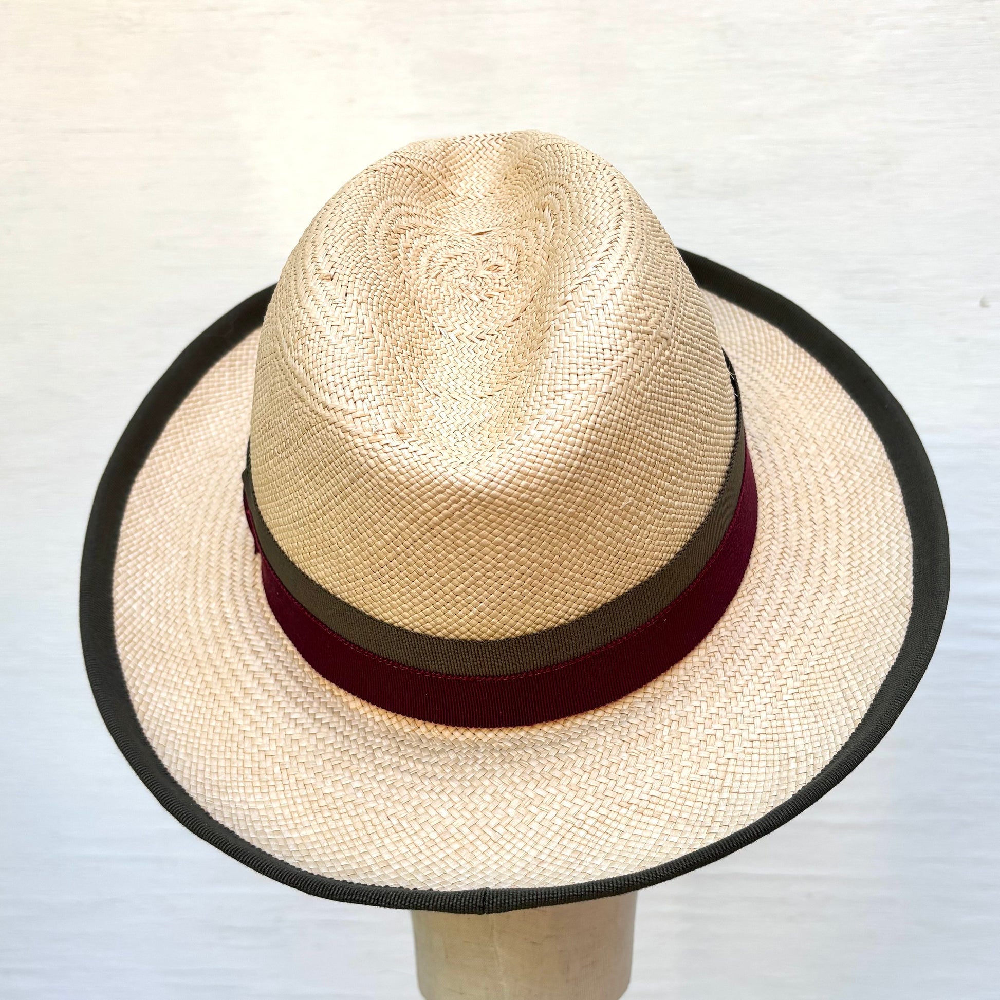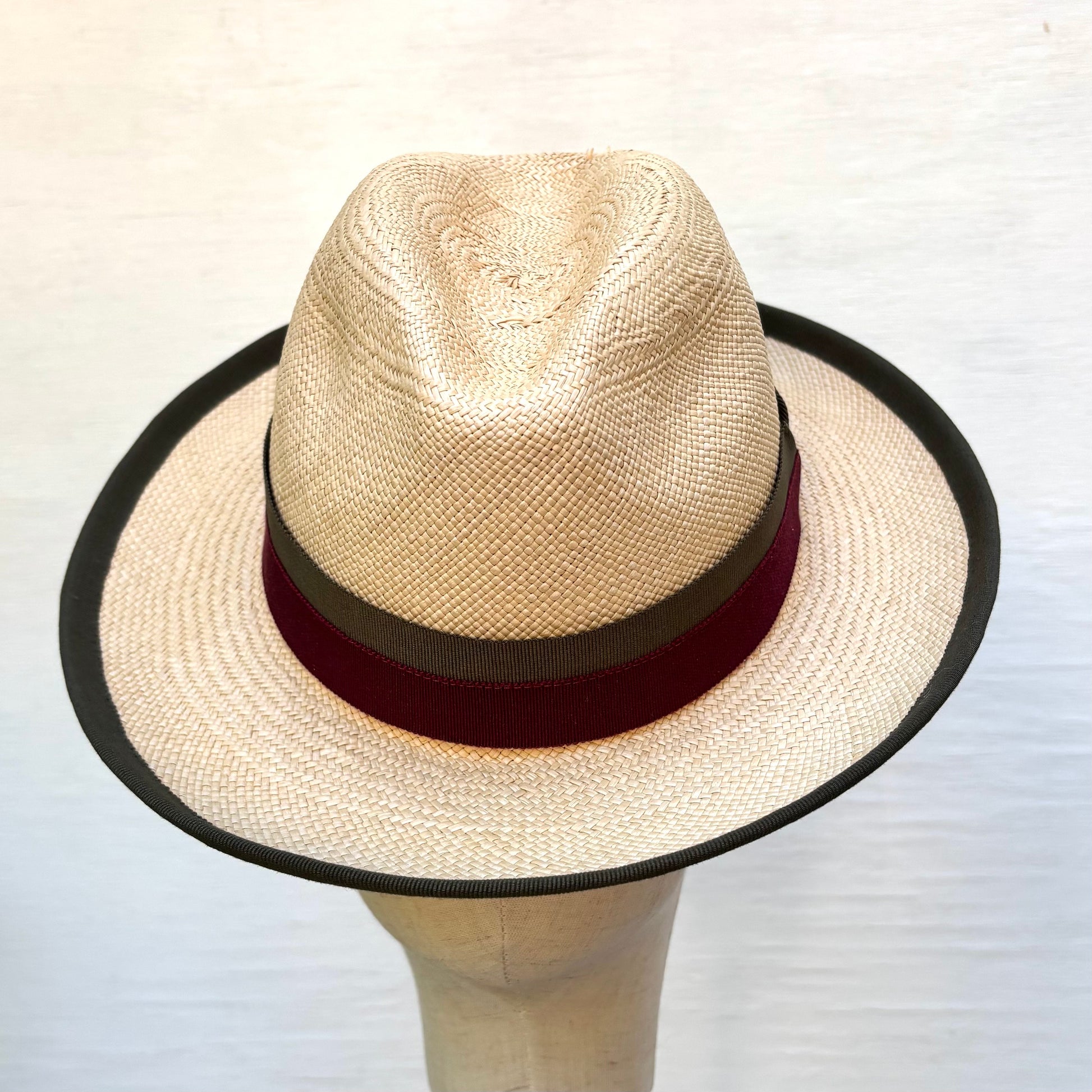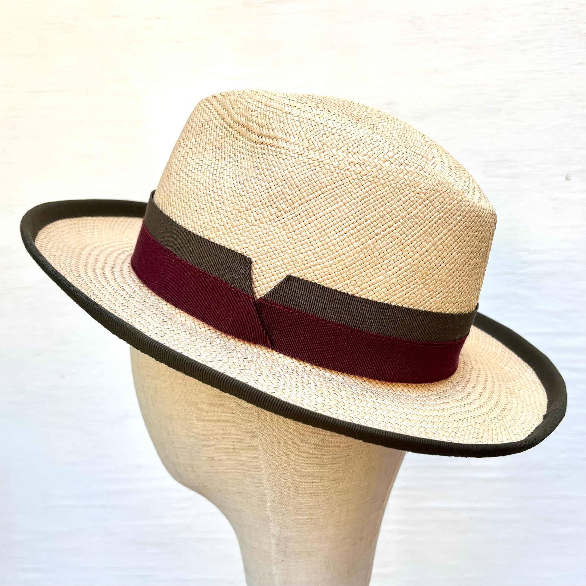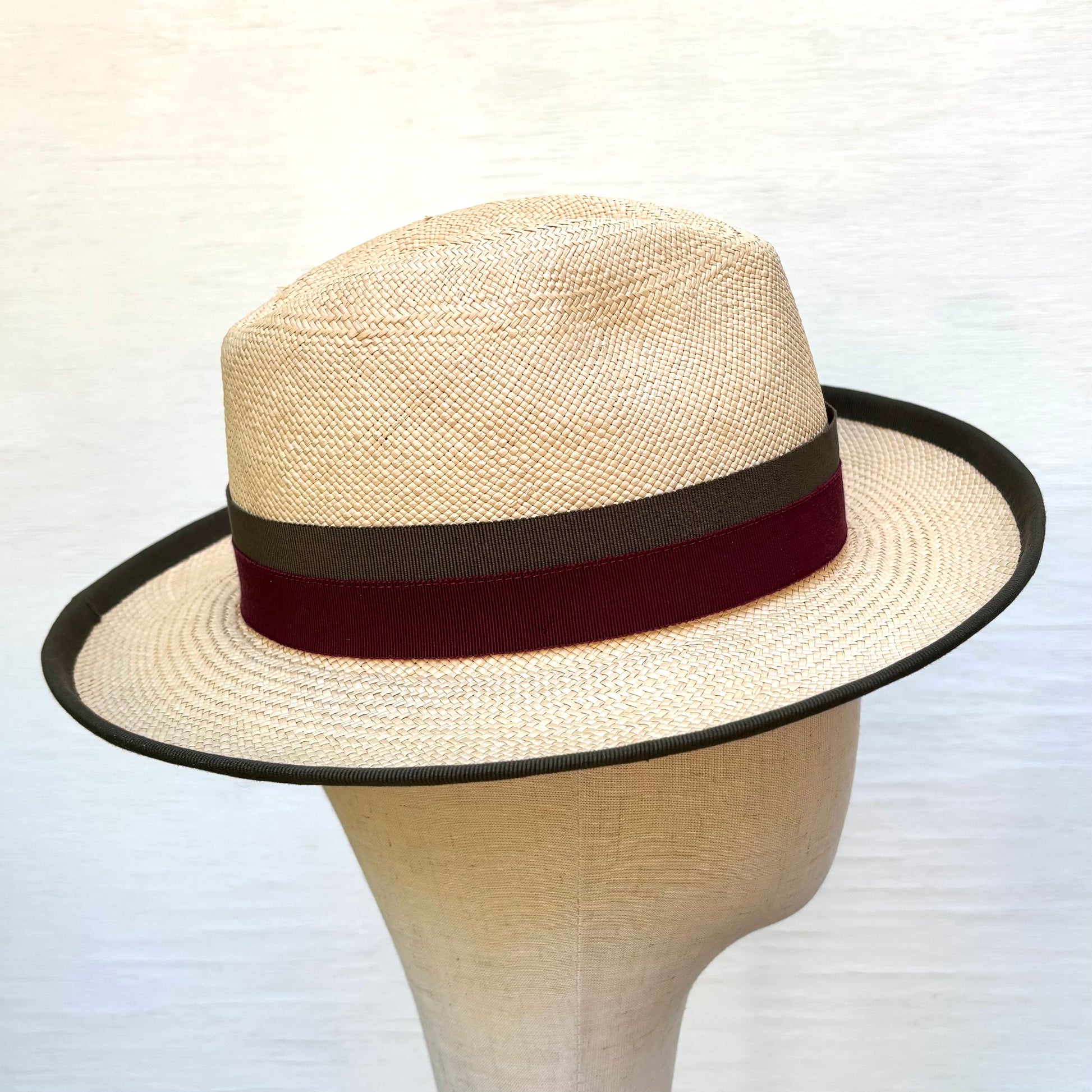 Make an impression with this elegant Panama straw fedora, handwoven in natural straw and finished with a 2.5" upturned brim. A hunter green grosgrain ribbon is hand-stitched along the brim edge, while the crown is accented with a wine and hunter green grosgrain band for a rich, refined look.