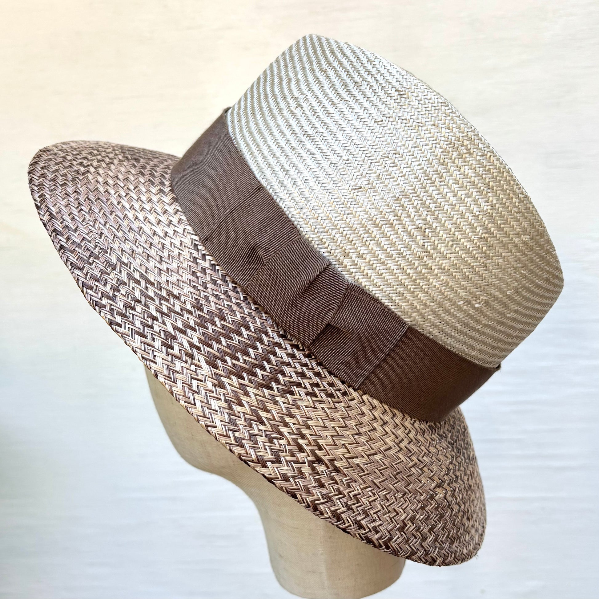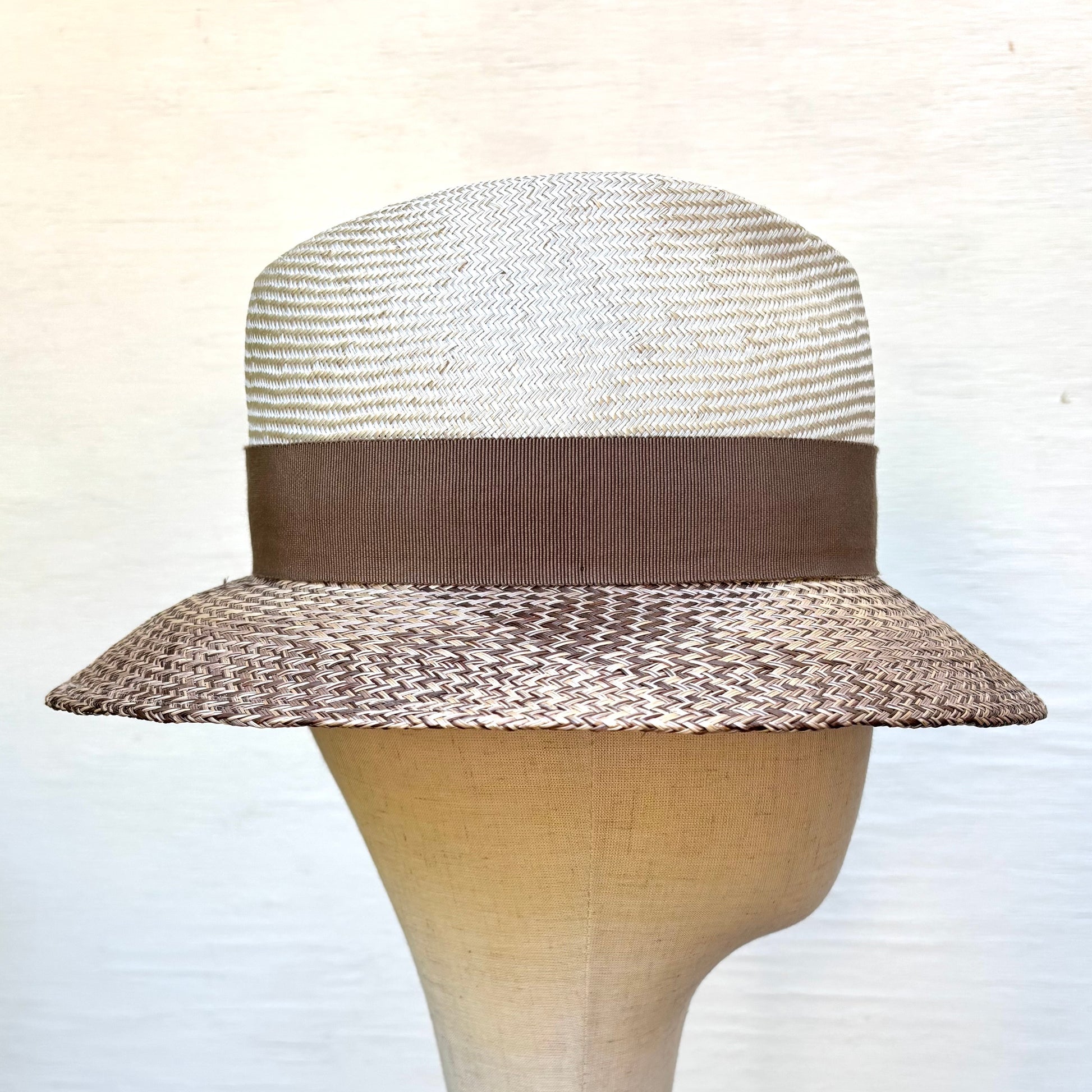 Make an impression with this elegant straw fedora, blending classic form with rich texture. The crown is hand-blocked from cream parasisal straw in a traditional homburg shape, offering timeless structure and style. A 3" brim in a striking mix of brown, tan, and cream buntal straw adds depth and contrast. Finished with a taupe grosgrain ribbon, this piece is refined, versatile, and effortlessly stylish.