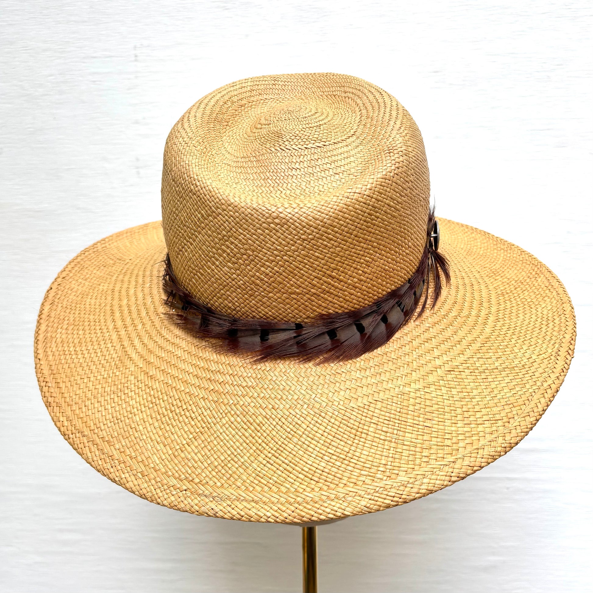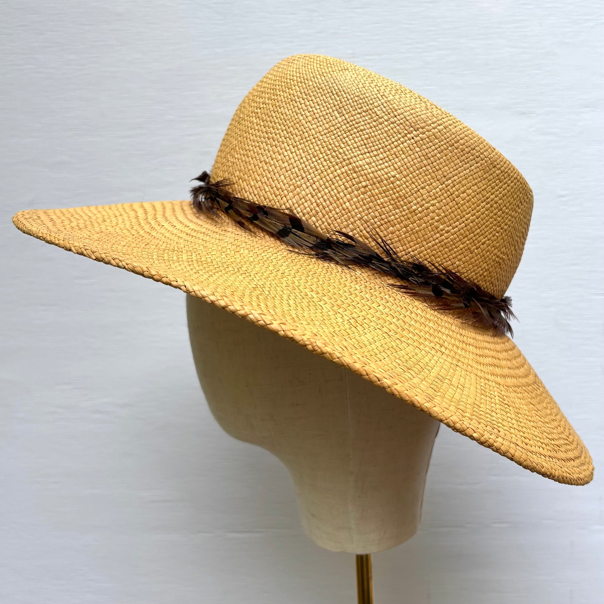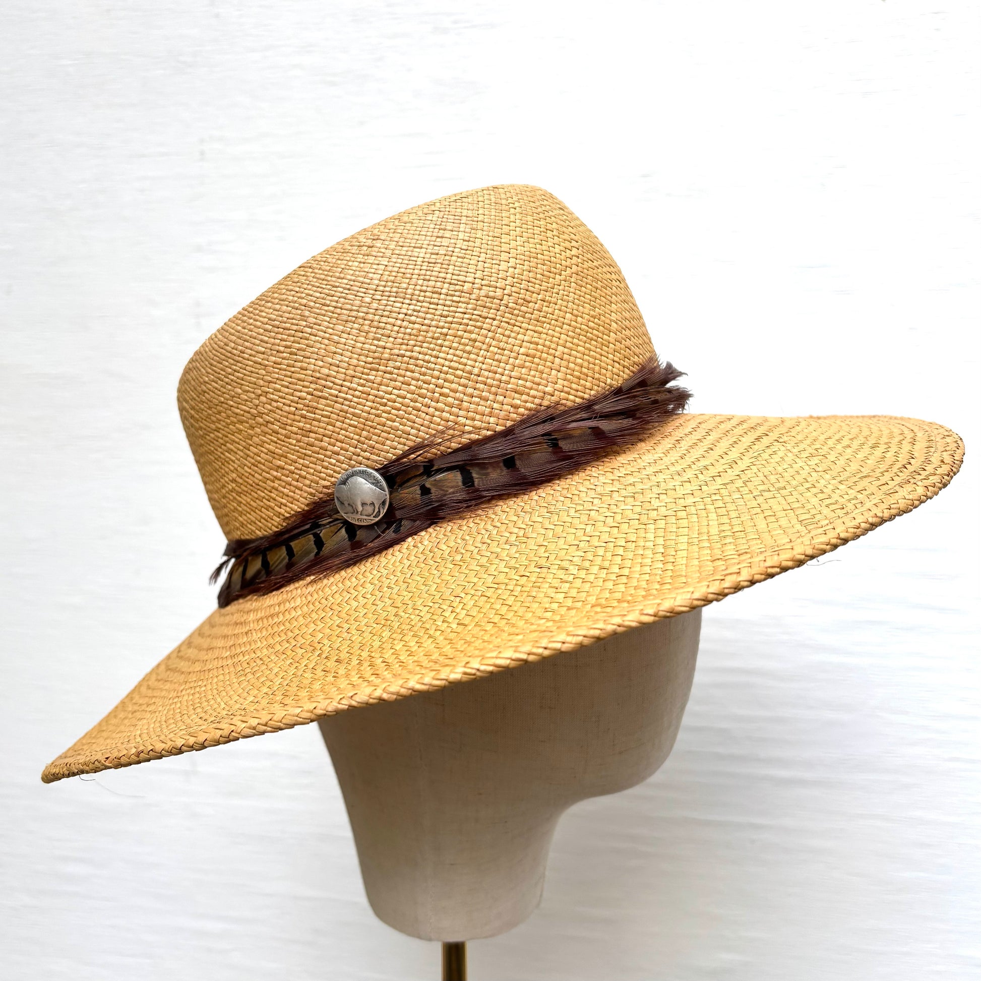 Make a statement with this distinctive Panama hat, hand-blocked in a rich caramel hue. The wide 4" brim offers ample sun protection, while two hand-stitched pheasant feathers and a silver button add a refined, nature-inspired accent.
