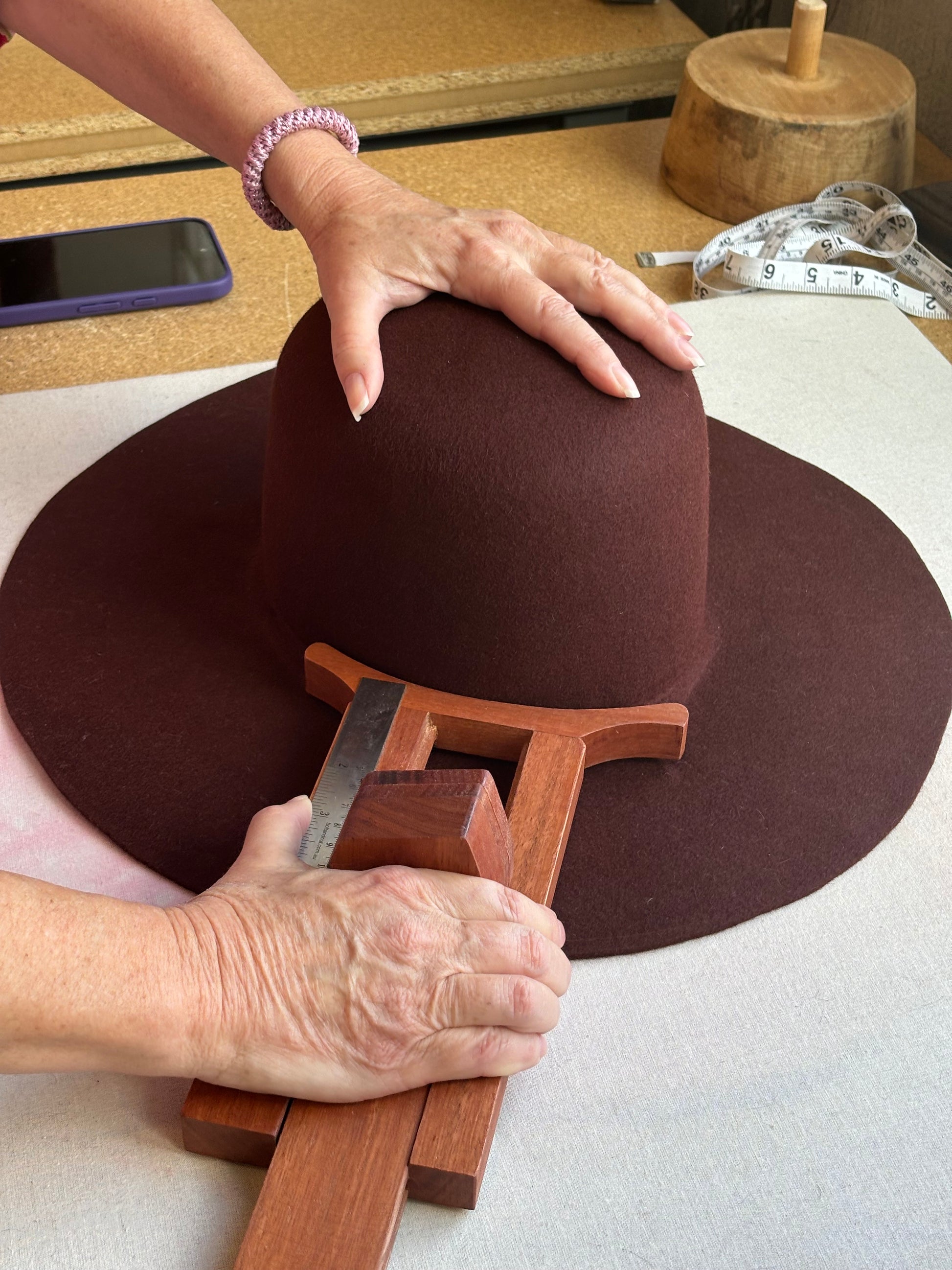 On Friday evening, you'll begin by blocking your fur felt hat body over one of our vintage wooden hat blocks. Saturday's session will focus on trimming the brim with a rounding jack, hand-shaping the crown, sewing in a ribbon sweatband, and finishing with classic ribbon trim.