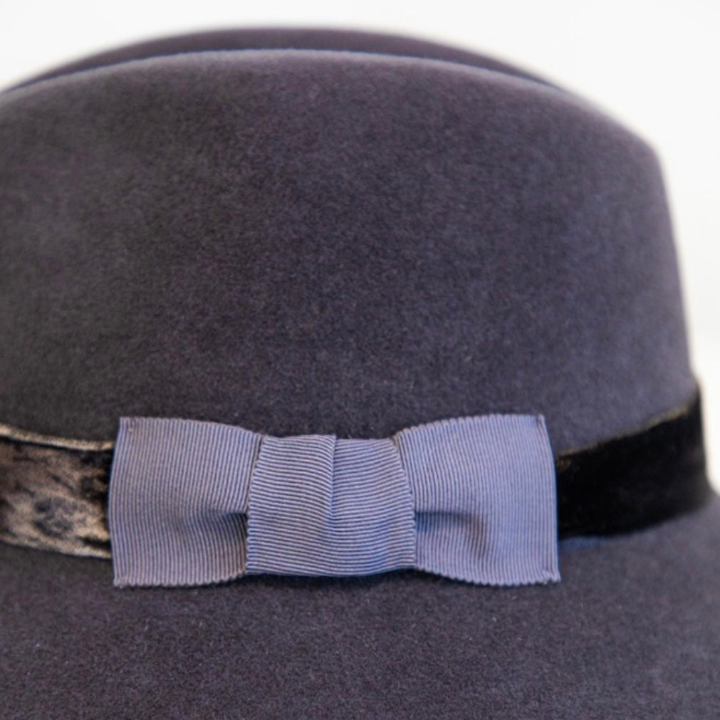 Our hand-blocked Cleo fedora hat is beautifully made in fur felt. The hat features a 4" sloped brim and 4” crown. Trimmed in hand-dyed velvet ribbon with a grosgrain ribbon bow.