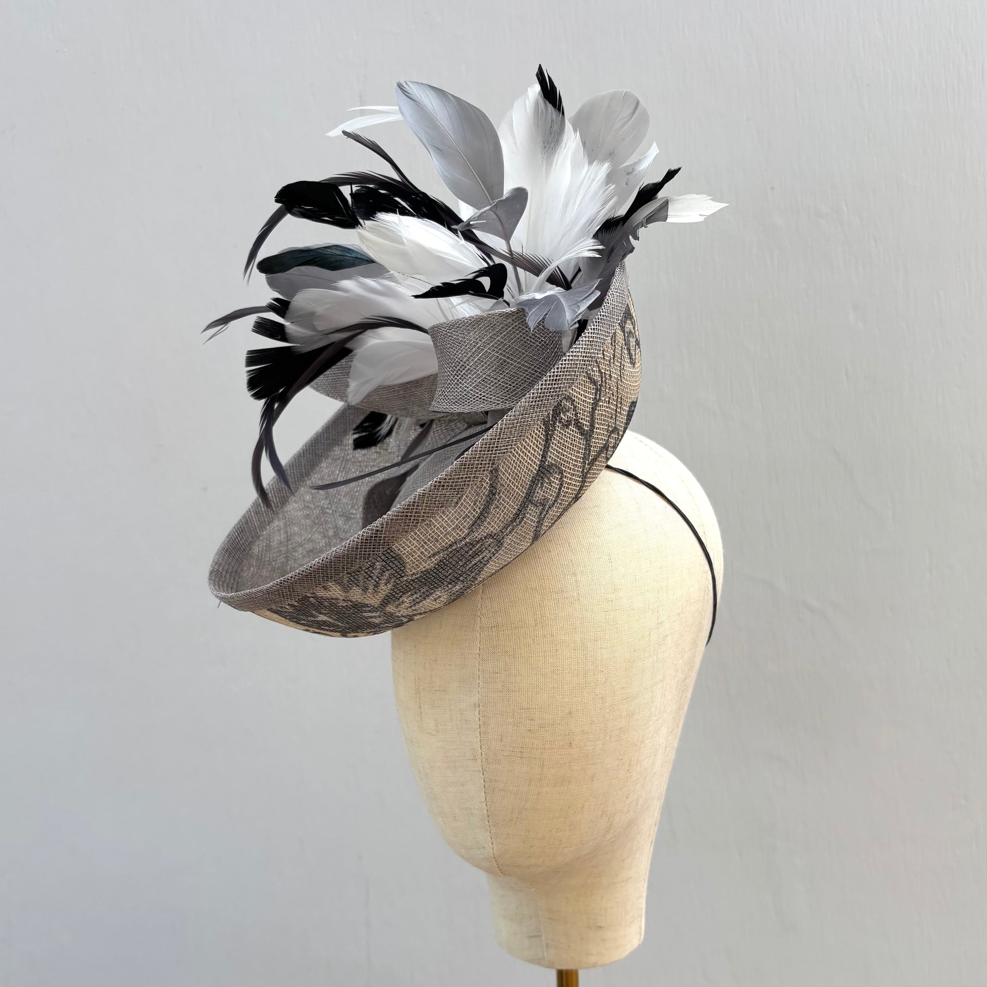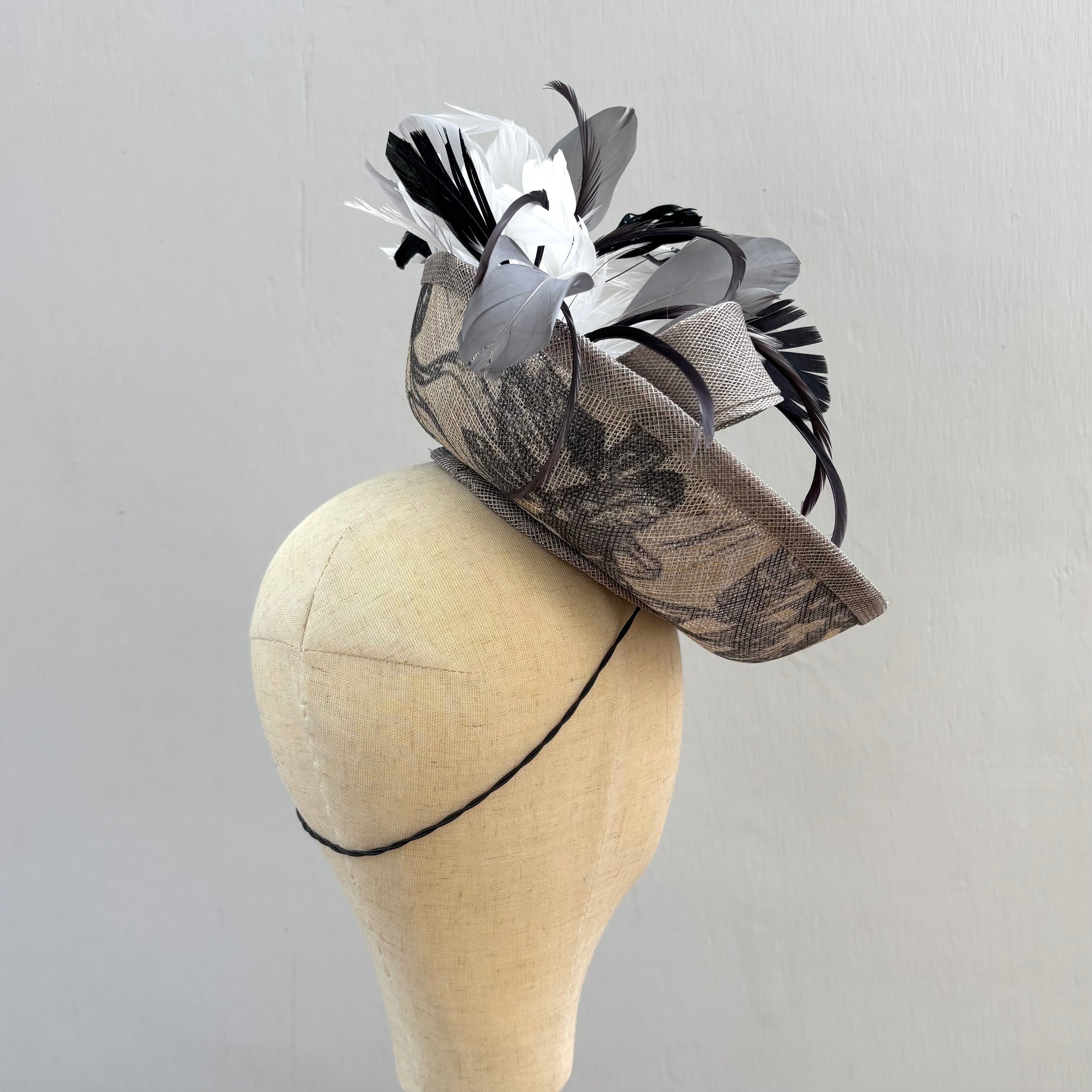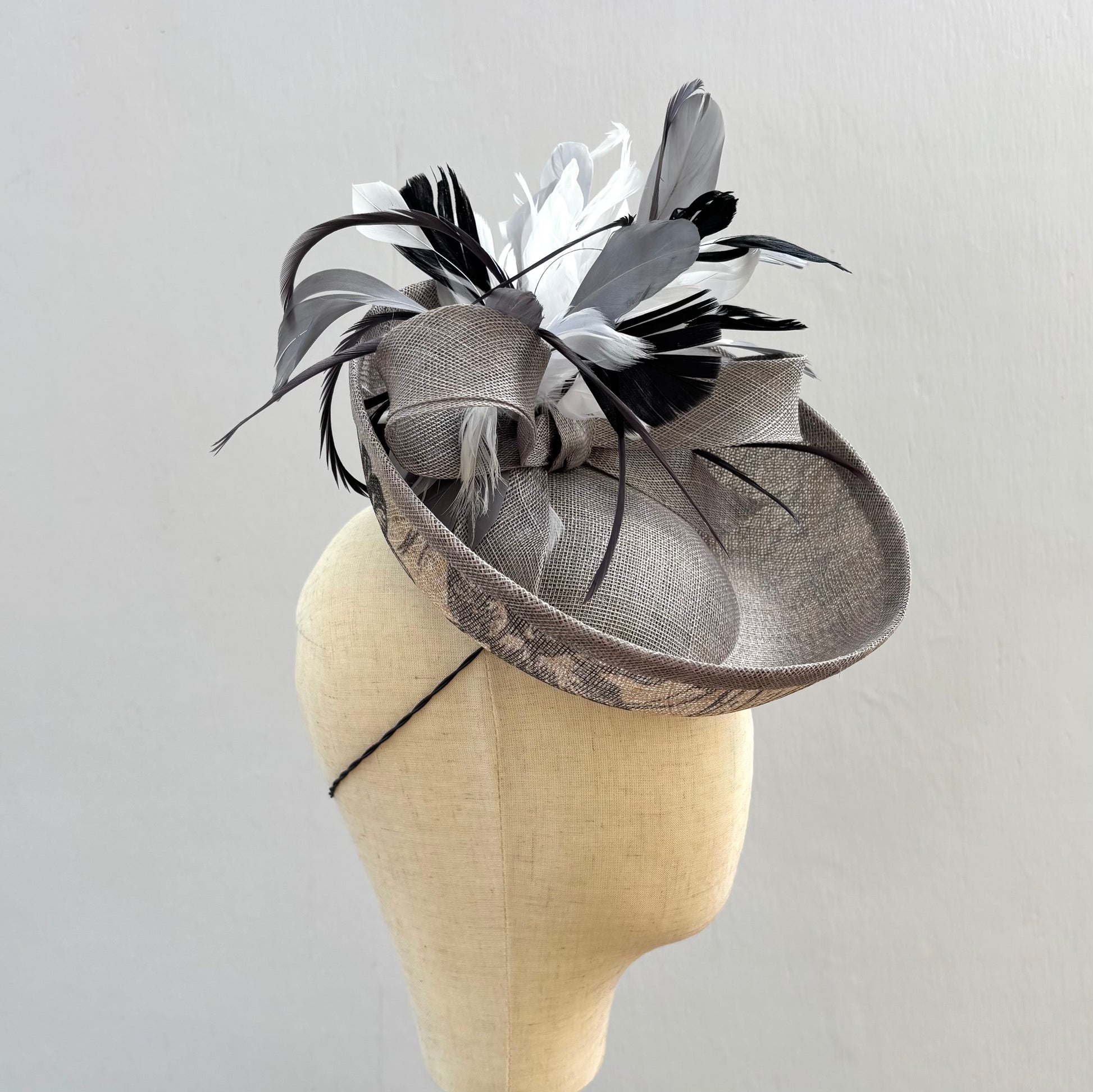 Our saucer fascinator is expertly hand-blocked from grey sinamay straw and features a delicate floral-printed sinamay on the underside for a subtle pop of pattern. It's adorned with a graceful arrangement of grey, black, and white feathers, complemented by a sculpted grey sinamay bow for a refined finish. Designed to perch elegantly on the right side of the head, it stays securely in place with a comfortable elastic band—ideal for weddings, races, or any special occasion.