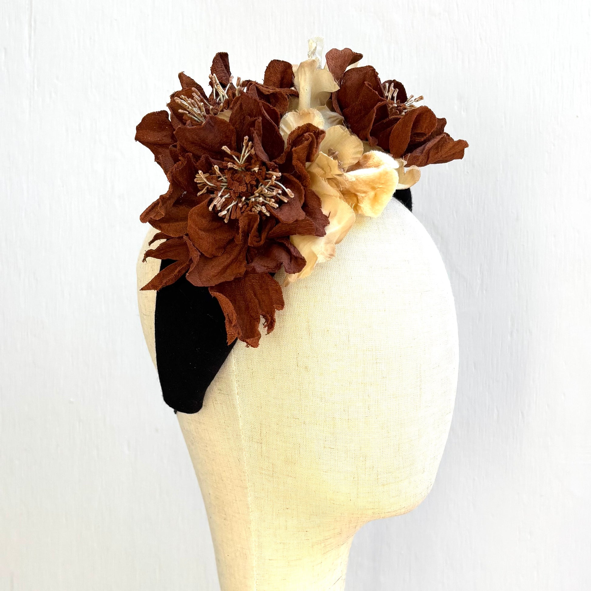 Our timeless Halo headband is expertly hand-blocked from luxurious black fur felt and embellished with intricate vintage silk flowers, along with handcraft flowers made from bark cloth. It is designed with an elastic band for a secure and comfortable fit.