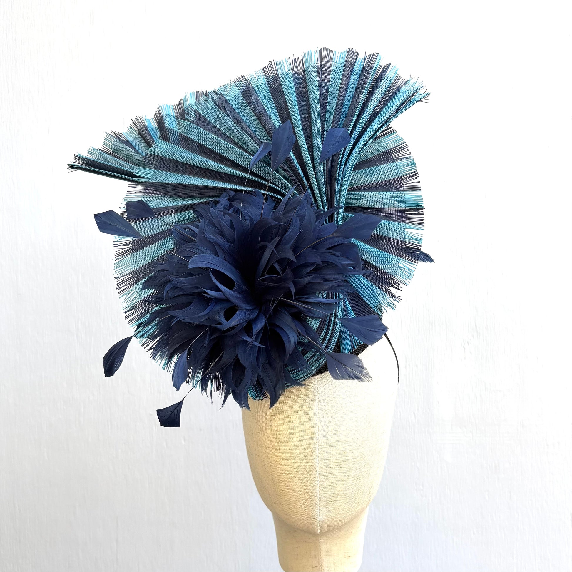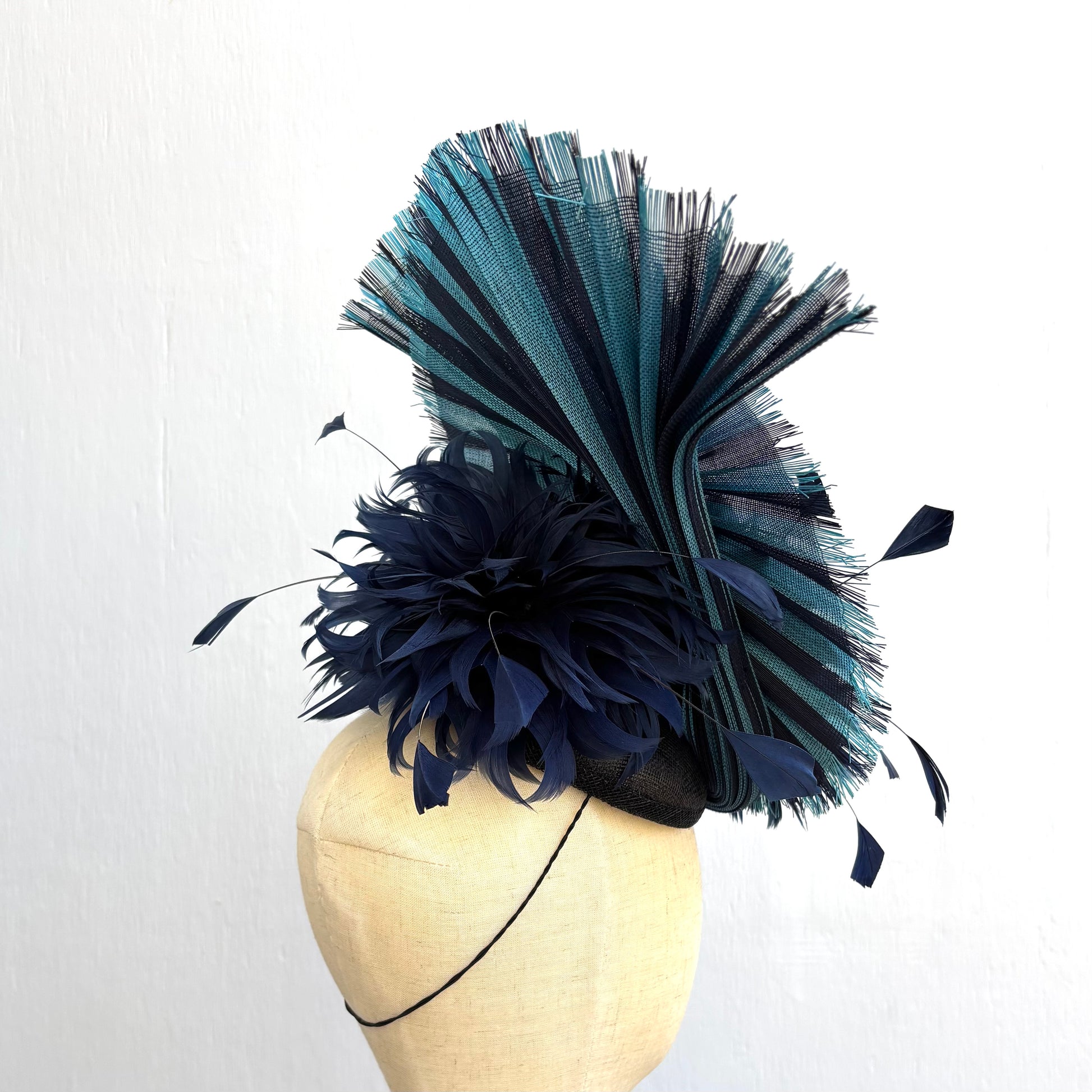 This statement fascinator is hand-blocked in navy sinamay and features a striking jinsin straw swirl in navy and turquoise stripes, along with handcrafted feather flowers in navy. Designed to sit on the right side of the head, it is securely attached with an elastic band.