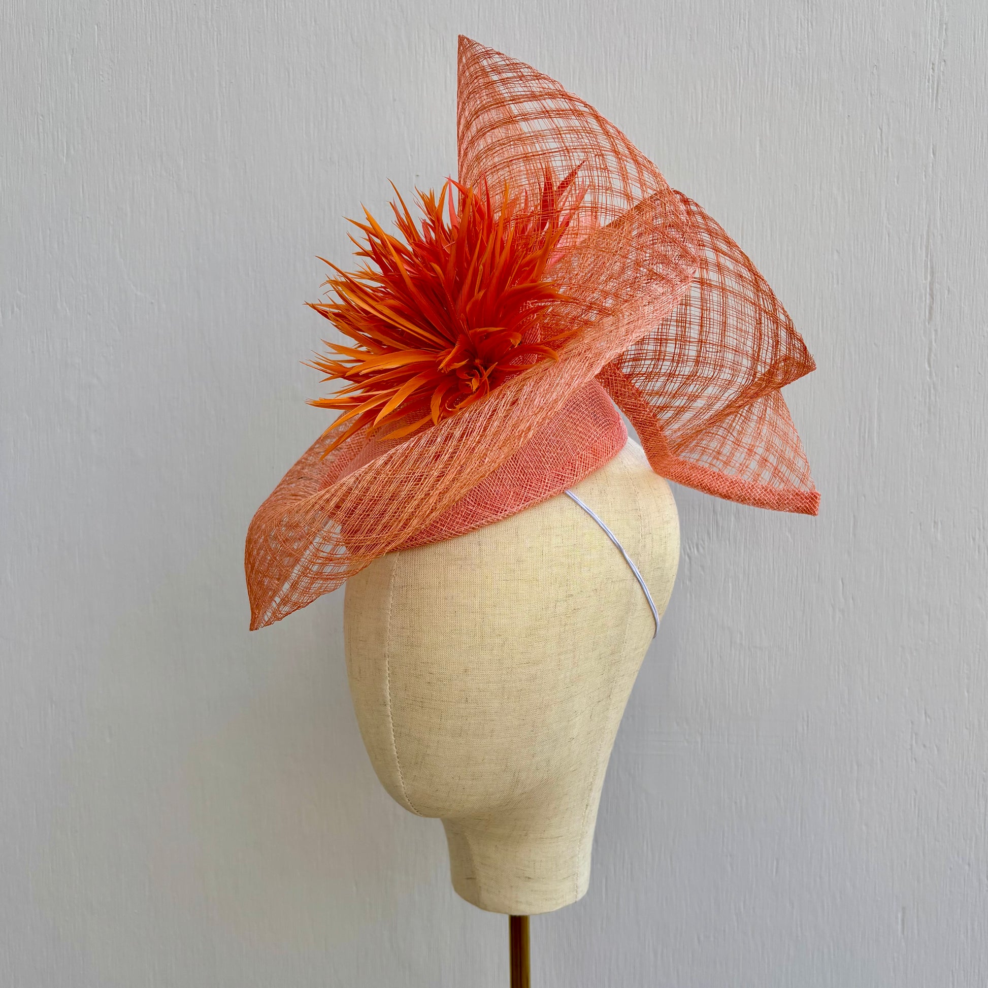 Our timeless swirl fascinator is meticulously hand-blocked using vibrant orange sinamay. It boasts an asymmetrical base adorned with a swirl of windowpane sinamay for added elegance. The piece is finished with spikey orange feather flowers. Designed to be worn on the right side, it’s securely attached with an elastic band for a comfortable fit.