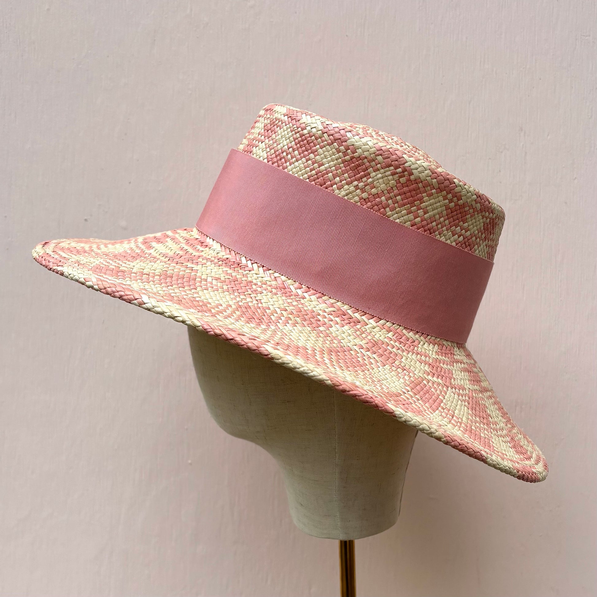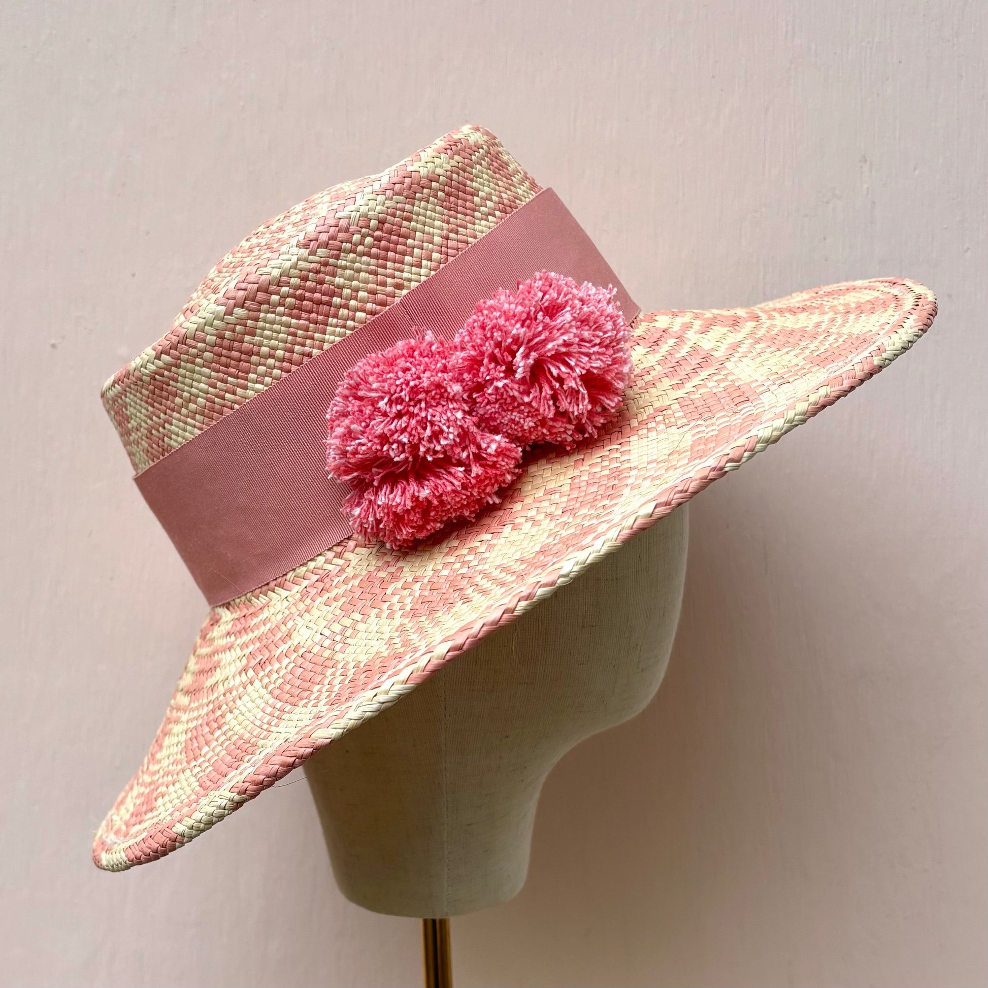 Turn heads with this eye-catching Panama straw hat, featuring a soft pink and cream checkerboard pattern that exudes playful sophistication. The 4" brim provides generous sun protection, while a classic 2" pink grosgrain ribbon and two charming cotton pom poms add a whimsical touch.