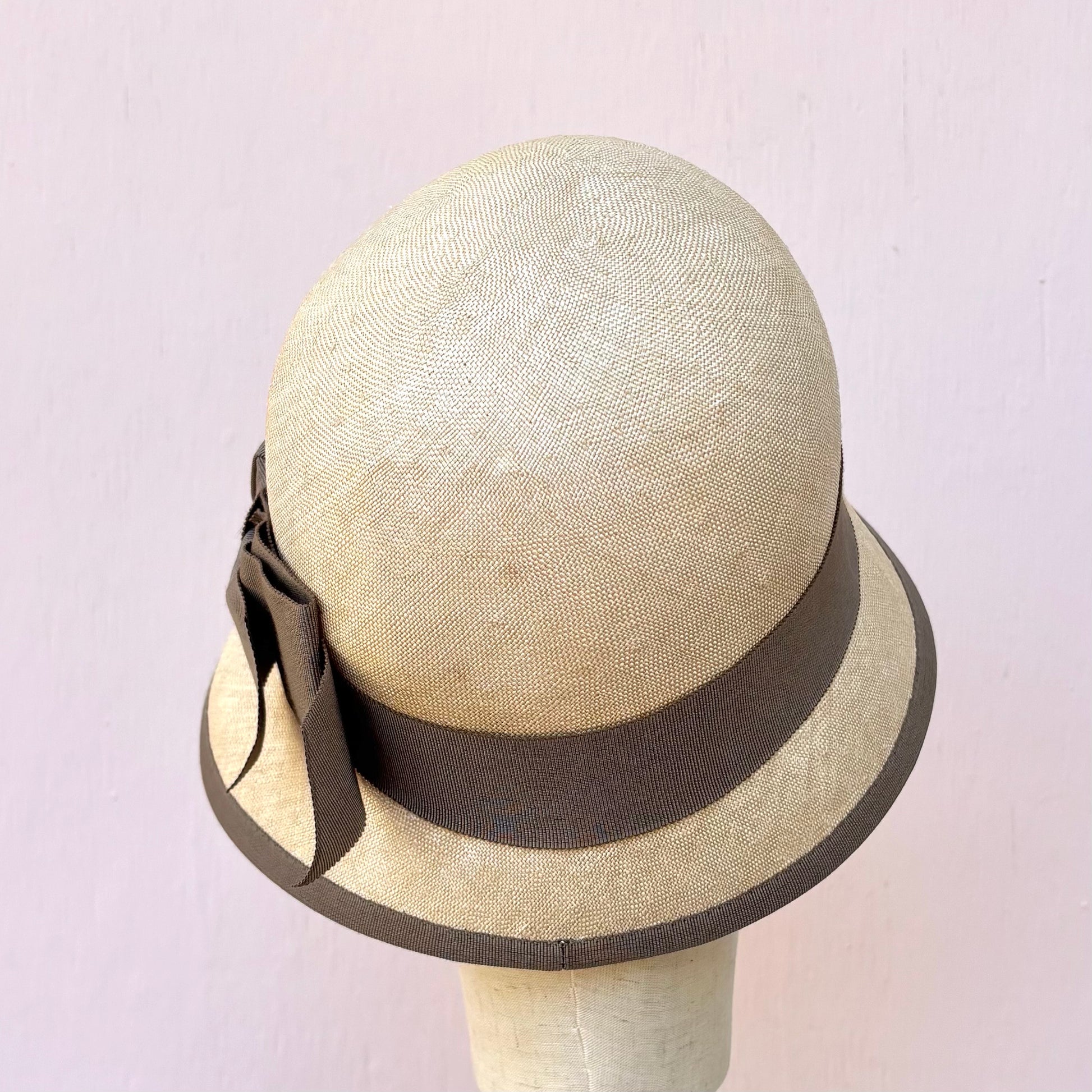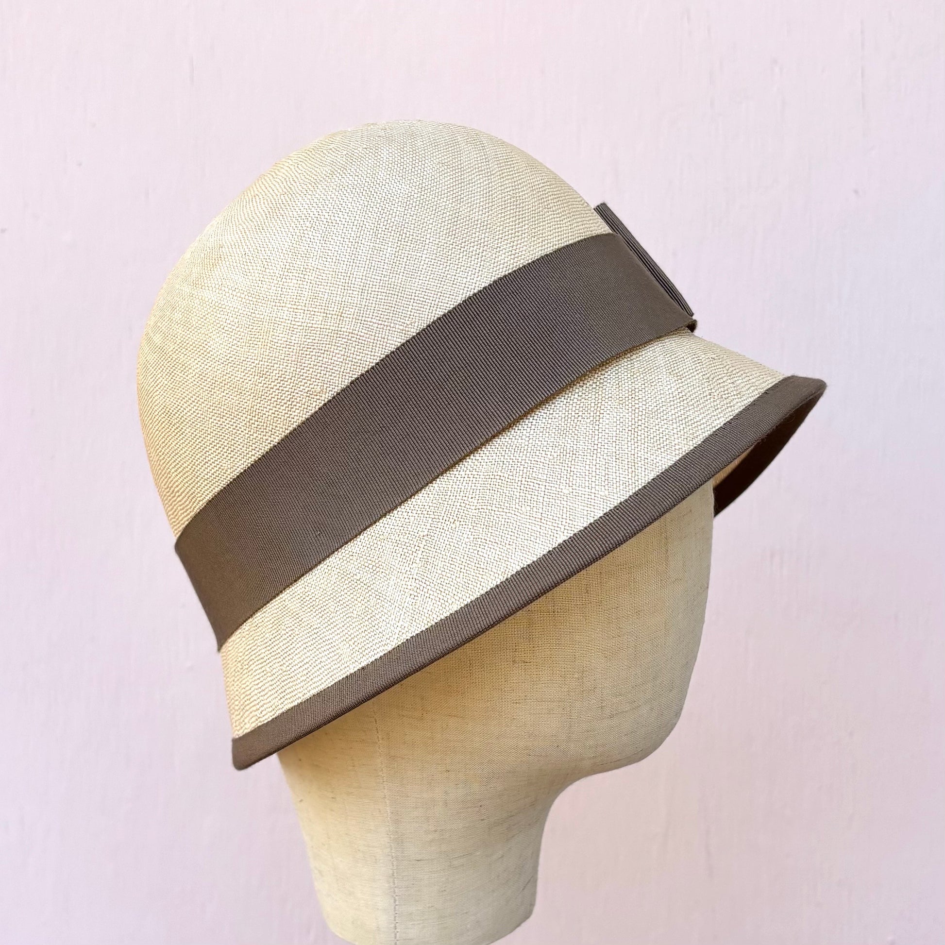 Elegant and timeless, our hand-blocked sisal straw hat channels the effortless style of the 1920s. Crafted over a classic cloche hat form, it features an asymmetrical brim that frames the face beautifully. The design is simply finished with a wide taupe ribbon and a striking oversized bow, while the brim is delicately edged by hand with coordinating grosgrain ribbon for a refined touch.