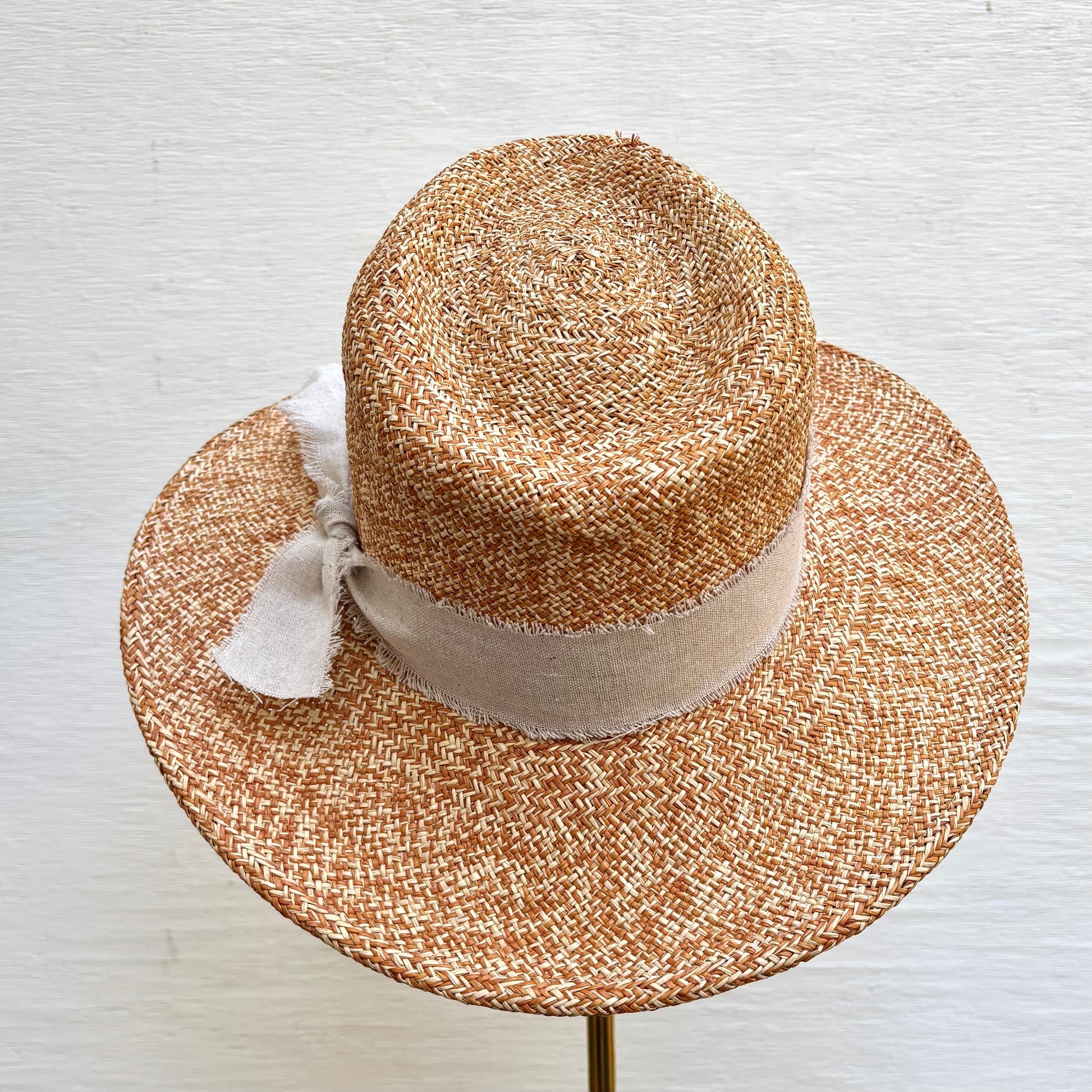 Make a stylish statement with this beautifully woven straw hat in a warm light brown and natural color palette. The 4" brim offers generous sun protection, while a distressed natural linen trim adds a relaxed, earthy elegance.