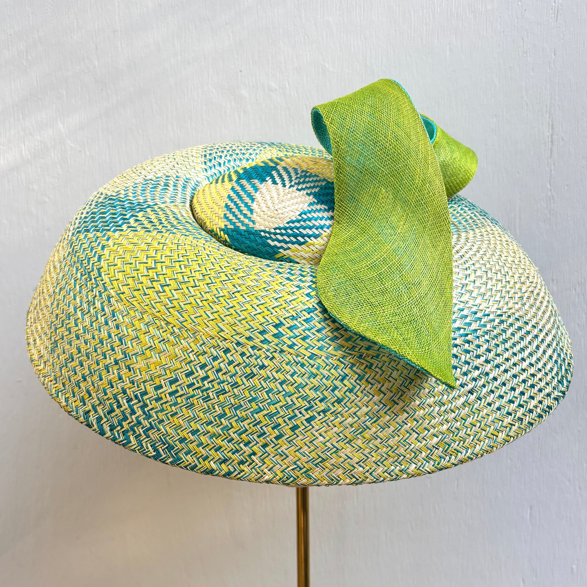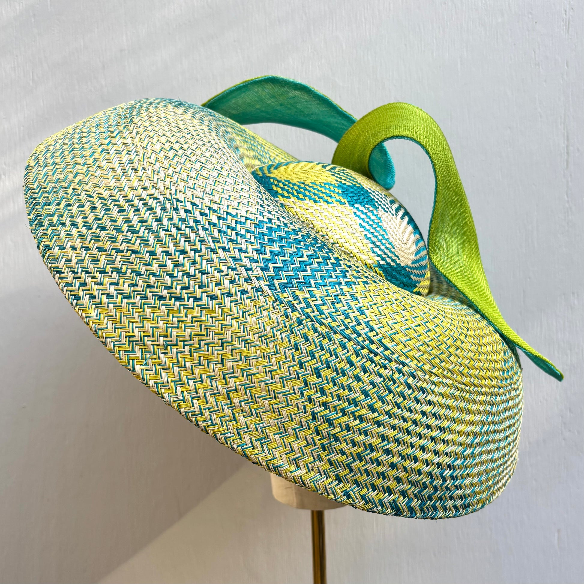 Make a bold statement with our handcrafted oversized saucer hat, created from a striking blend of white, teal, and green buntal straw. A dramatic 7" brim adds eye-catching flair, while a sculptural, double-sided sinamay swirl brings elegant movement and sophistication. Designed to perch gracefully on the right side of the head, this hat is comfortably secured with an elastic band for a stay-put fit throughout your event.