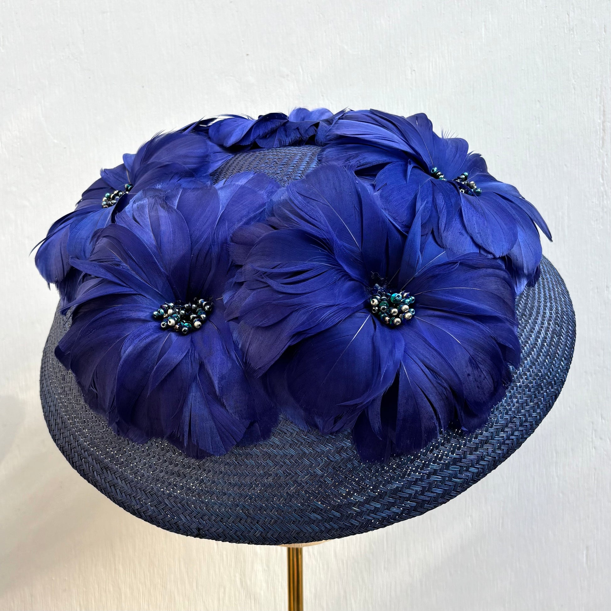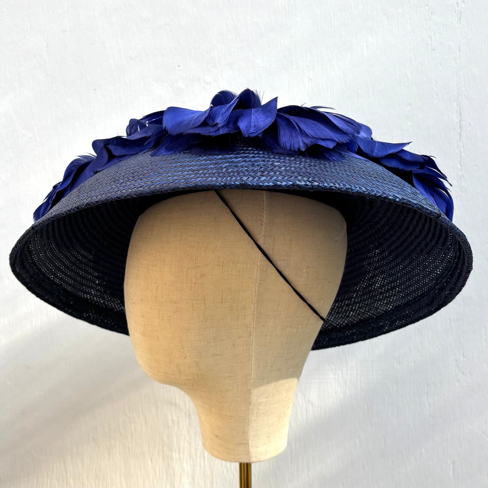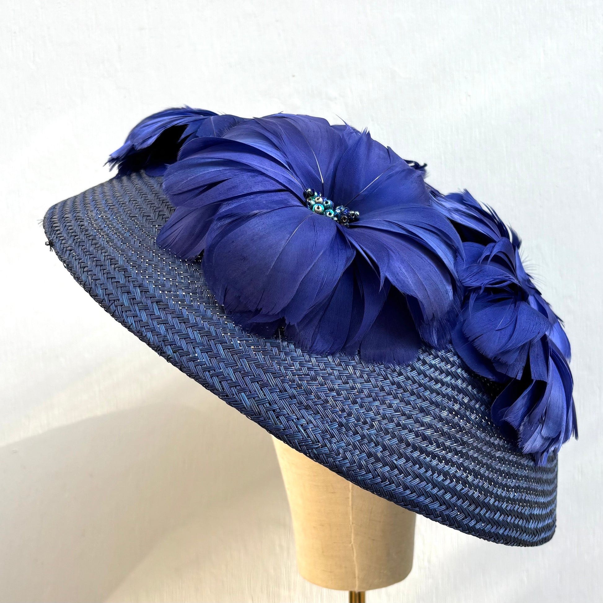 Command attention with our handcrafted saucer hat, beautifully made from striking navy buntal straw. The dramatic 5.5" brim creates an elegant, sweeping silhouette, while delicate, handcrafted feather flowers add texture and graceful movement. Designed to perch stylishly on the right side of the head, this statement piece is comfortably secured with an elastic band for a secure, all-day fit.