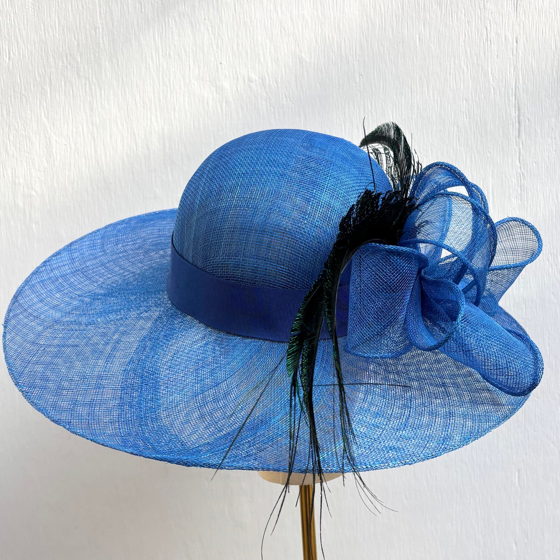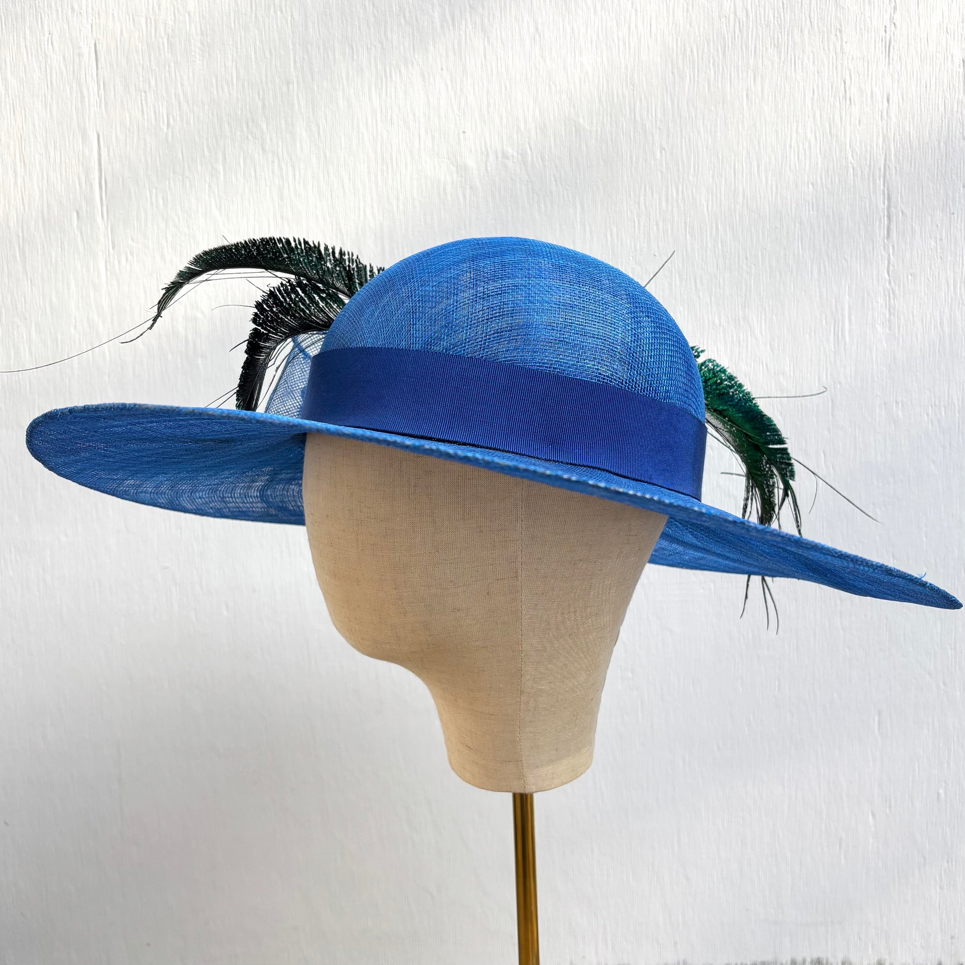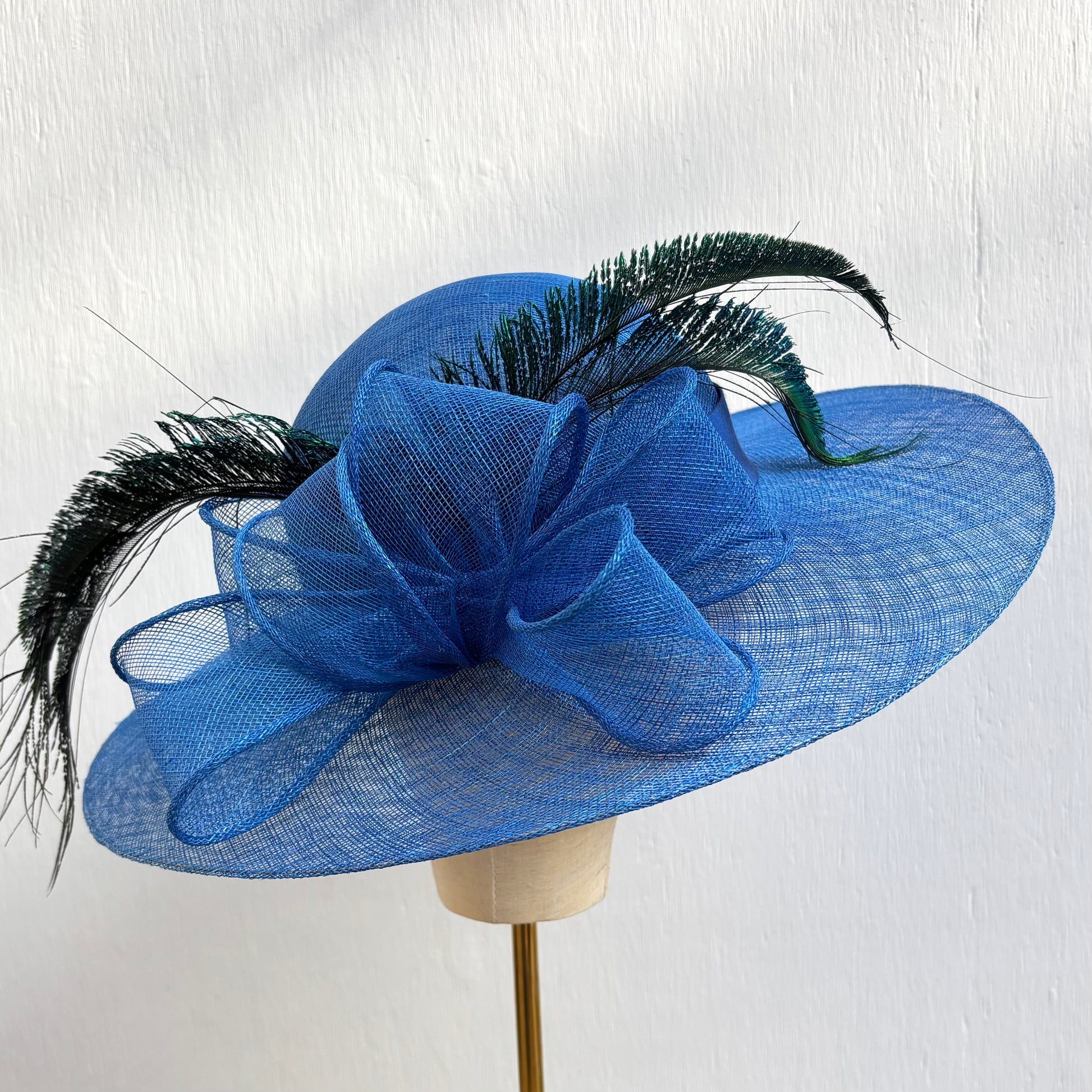 Hand-blocked in vibrant blue sinamay, this wide-brimmed hat is a perfect choice for weddings, races, or any standout occasion. The 5" bias brim offers graceful structure and sun coverage, while a sinamay bow accented with striking peacock feathers adds just the right touch of elegance and flair.